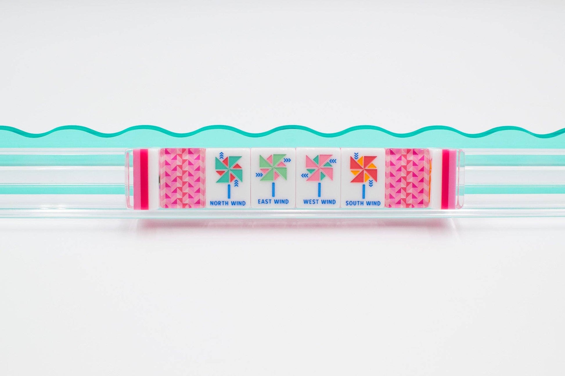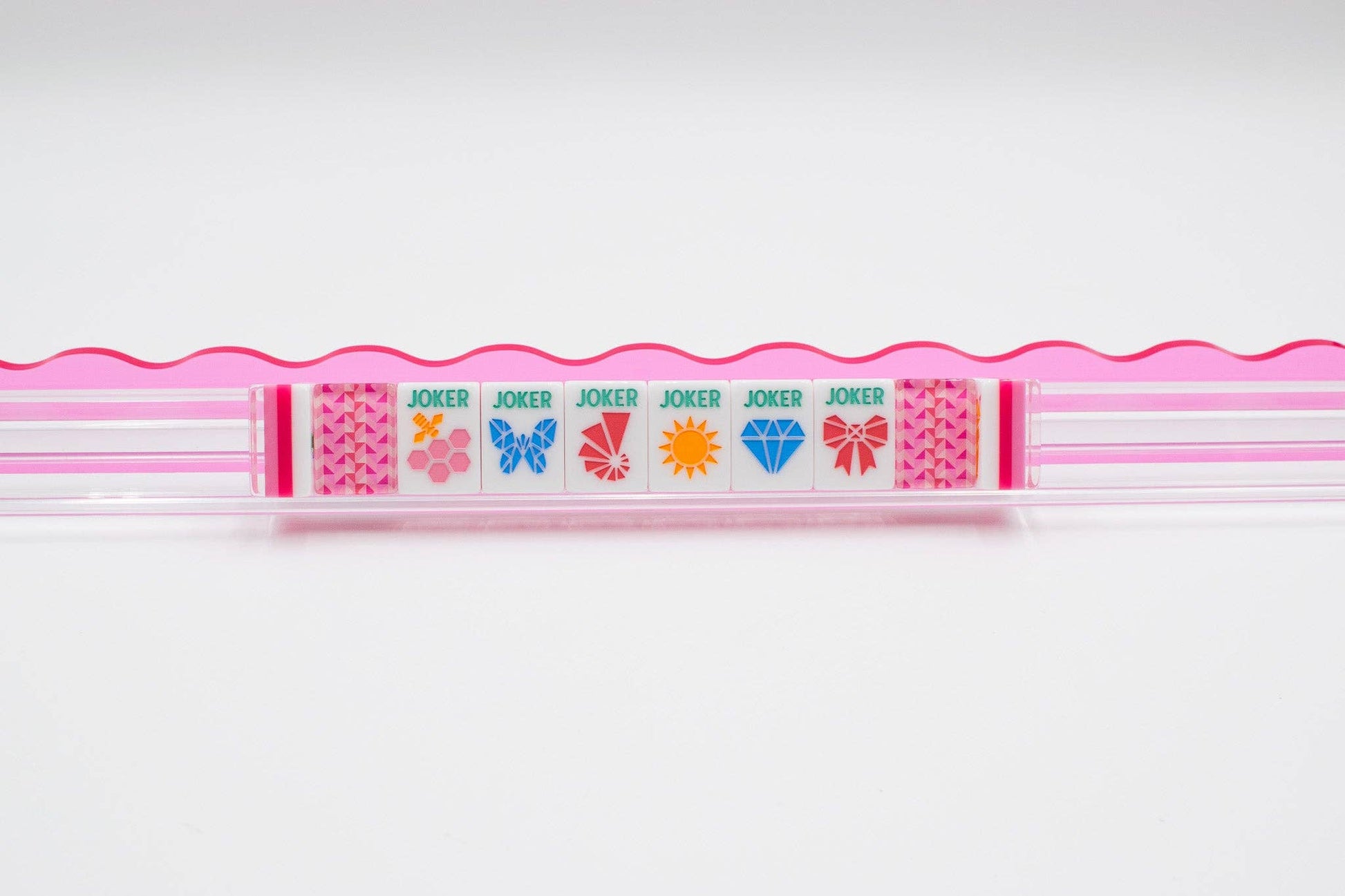 Introducing the Prism Series Tile Set in Pink. Mahjong with Bold Angles and Vibrant Vibes. This set is part of the Crystal Collection and features labeled tiles for ease of play, making it an incredible set to teach with and excellent for players wanting a touch of whimsy, but who appreciate clear tile identification! This set is delightfully chunky and includes designs that are geometric in nature, with all the right angles and a unique look and feel.