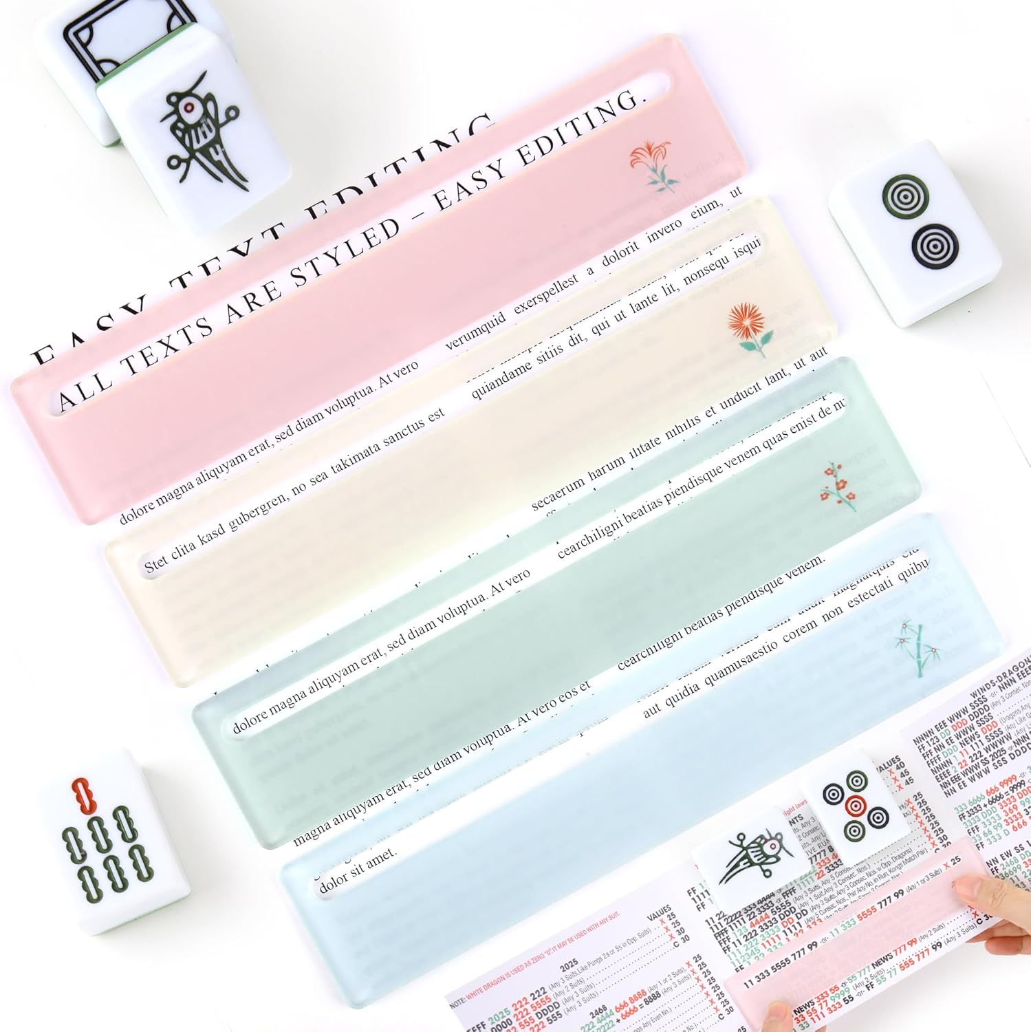 4-Pack Acrylic Mahjong Line Finders: Includes 4 clear plastic trackers in light pastel colors. Helps players keep track of their lines during the game.